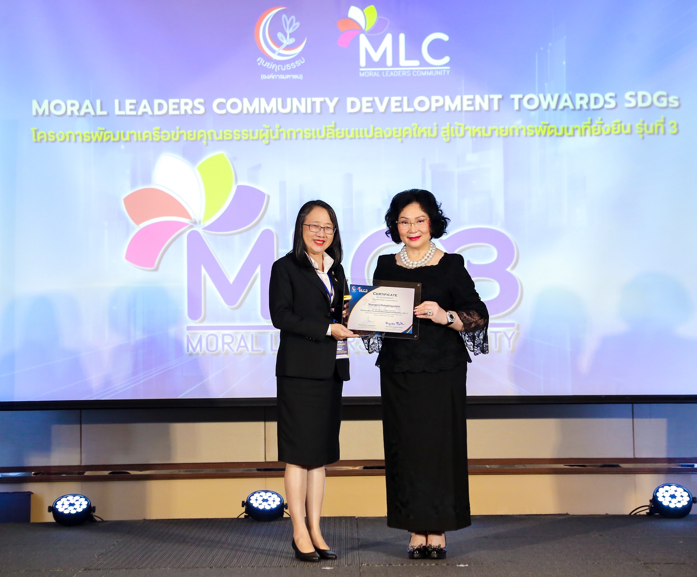 ศูนย์คุณธรรม (องค์การมหาชน) ประสบความสำเร็จในการจัด โครงการพัฒนาเครือข่ายคุณธรรม ผู้นำการเปลี่ยนแปลงยุคใหม่สู่เป้าหมายการพัฒนาที่ยั่งยืน รุ่นที่ 3 (MLC3) ซึ่งจัดขึ้นระหว่างวันที่ 4 กุมภาพันธ์ – 8 เมษายน 2569 โดยมีพิธีปิดและนำเสนอผลงาน ณ โรงแรมฮอลิเดย์ อินน์ สีลม กรุงเทพฯ โดยได้รับเกียรติจาก คุณหญิงปัทมา ลีสวัสดิ์ตระกูล ประธานกรรมการศูนย์คุณธรรม เป็นประธานในพิธีพร้อมมอบเกียรติบัตรแก่ผู้ผ่านการอบรมจำนวน 31 คน จาก 31 องค์กร