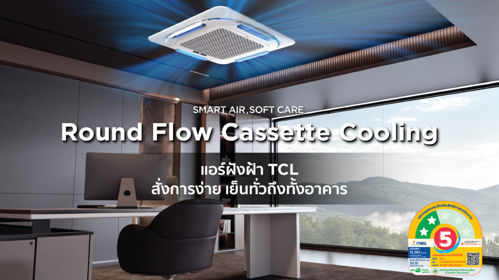 • Cassette Cooling – สั่งการง่าย เย็นทั่วทั้งอาคาร กระจายลม 360 องศา พร้อมดูปริมาณการใช้ไฟได้ง่าย ๆ ผ่าน TCL Home APP